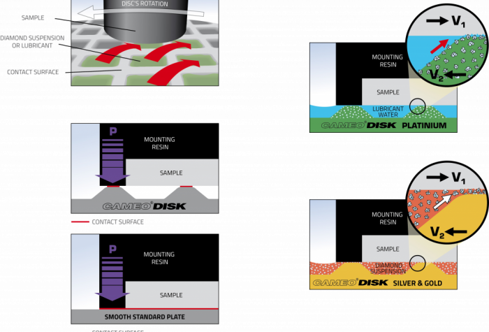 Tarcza szlifierska CAMEO DISK ma strukturę plastra miodu , dzięki czemu umożliwia zmniejszenie powierzchni stykającej się z polerowaną próbką. Ciśnienie wymagane do zeszlifowania próbki jest znacznie mniejsze, niż ciśnienie zwykle stosowane podczas używania papieru ściernego.